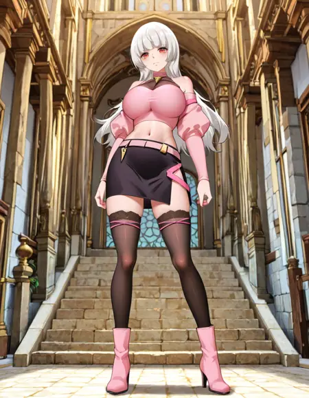 ailu,1girl,long hair,solo,bare shoulders,red eyes,white hair,large breasts,detached sleeves,pink shirt,crop top,midriff,long sleeves ,skirt,navel,black skirt,belt,high heel boots,miniskirt,black thighhighs,pink footwear