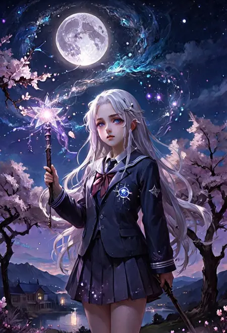米拉·山奈,本名天野镜,是超级比亚档案馆前“三位一体七人组”成员,同时也是禁忌书库安全部门的负责人。由于她的本性与职责,她在阿塔拉调至圣经馆初期对他抱有敌意,但最终接纳了他作为盟友与朋友。 - 使用强度 0.5 - 示例提示 - 神秘的高中少女,拥有银白色飘逸长发与紫罗兰色眼睛,站在布满旋转星象与发光樱花的黄昏天幕下;她的校服柔和地泛着超凡光芒,手持一根由水晶与月光制成的星辰法杖;场景传递出宁静、神秘与沉静的力量——动漫风格插画,细节精致,光线柔和,充满梦幻氛围