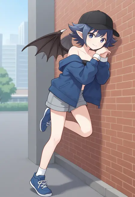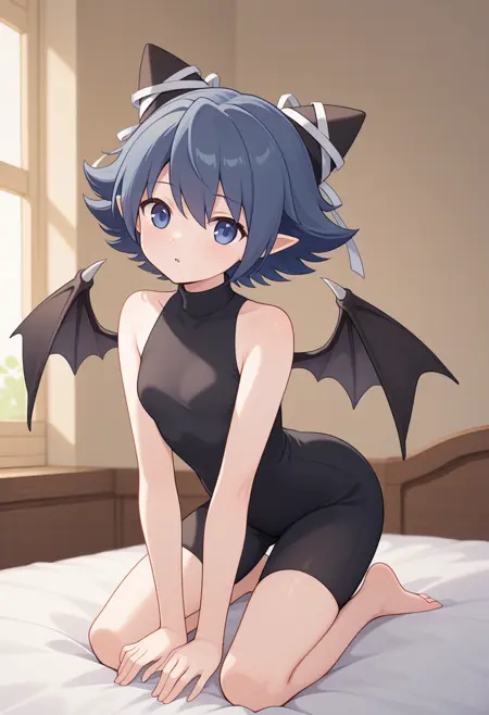キーワード: sereneriviera、青髪、短髪、ふわっとした髪、青い目、尖った耳、コウモリの翼、帽子のリボン、動物の帽子、カーペット、包帯で巻かれた手首、手袋、短いユニタード、タートルネック、コート、包帯で巻かれた足首、ハイヒールブーツ