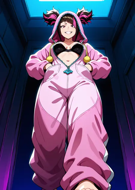 パジャマ衣装(SF6 の別衣装): ピンクのオネシー、黒の下着、黒のビキニトップ、短いビッグテール、黄色のドローストリング、ジッパー、髪にピンクのストライプ、