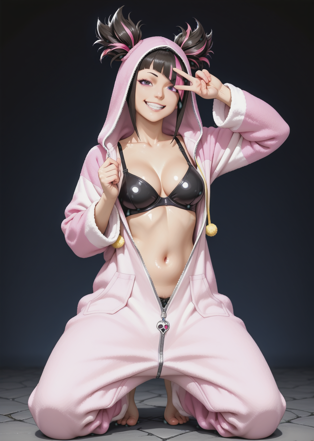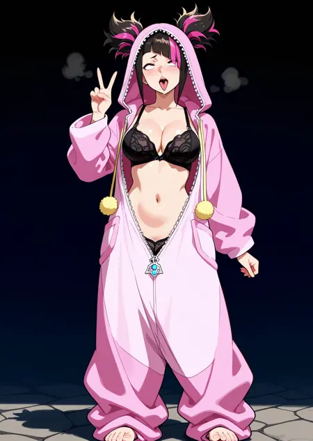 잠옷 옷 (SF6 대체 옷): 분홍색 원피스, 검은 속옷, 검은 비키니 상의, 짧은 돼지 꼬리, 노랑색 끈, 지퍼, 머리에 분홍색 스트라이프,
