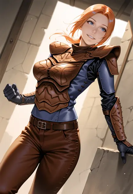 studded leather scale armor, cuirass, shoulder armor, studded leather bracer, rerebrace, brown pants, belt, gloves