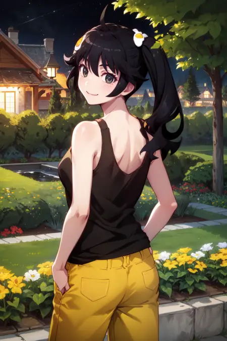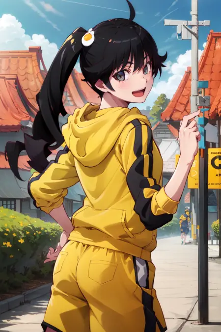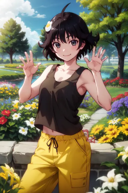 araragikaren, short hair, ahoge, yellow pants, short pants, black tank top, egg hair ornament.
