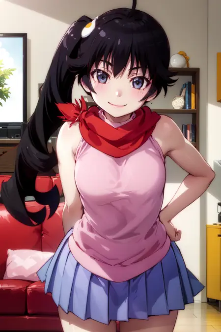 araragikaren, long hair, pink sleeveless, medium breasts, ahoge, side ponytail, egg hair ornament, red scarf, skirt