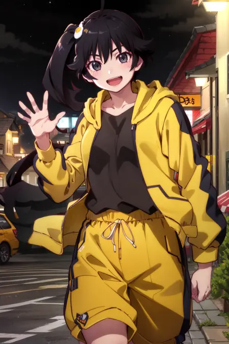 araragikaren, long hair, side ponytail, jacket, ahoge, shorts, hood, hoodie, track jacket, yellow shorts, hooded track jacket, egg hair ornament, black shirt