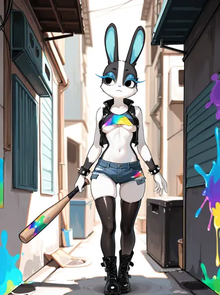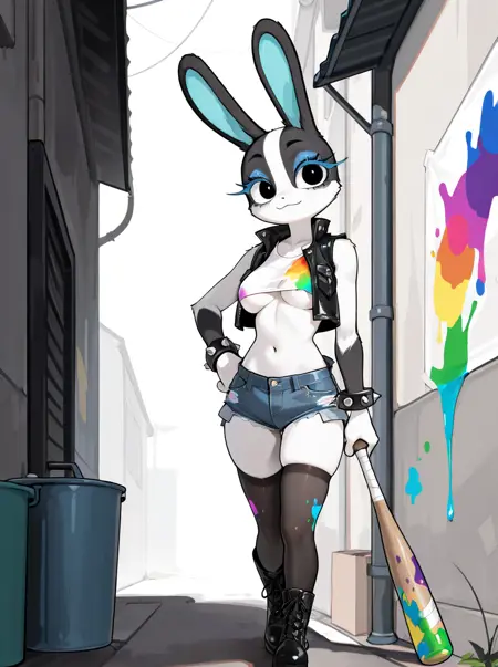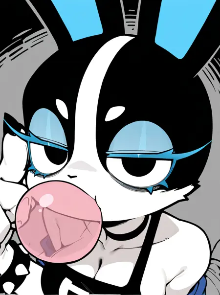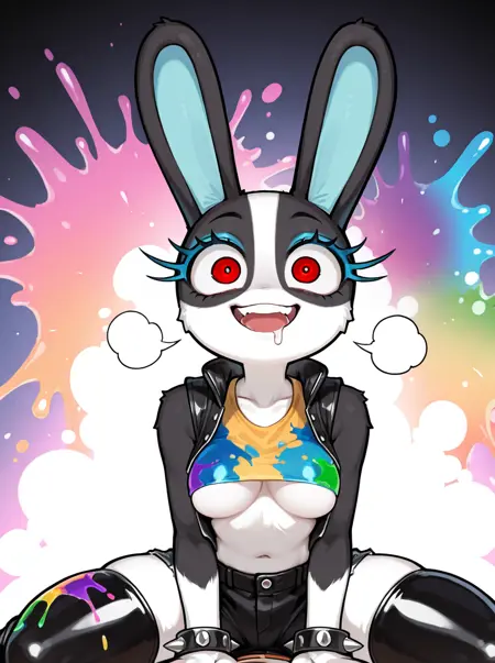 Triggers: anthro, female, lagomorph, white fur, black fur, two tone face, black eyes