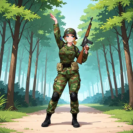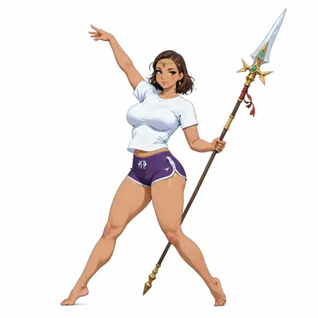 짧은 형태 캡션: yd woman, 1girl, holding spear, dancing pose, full body