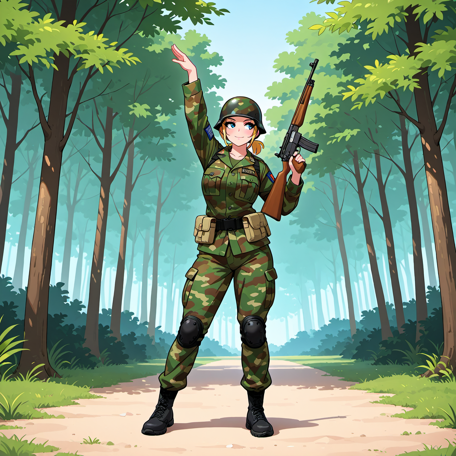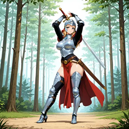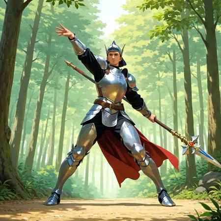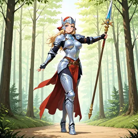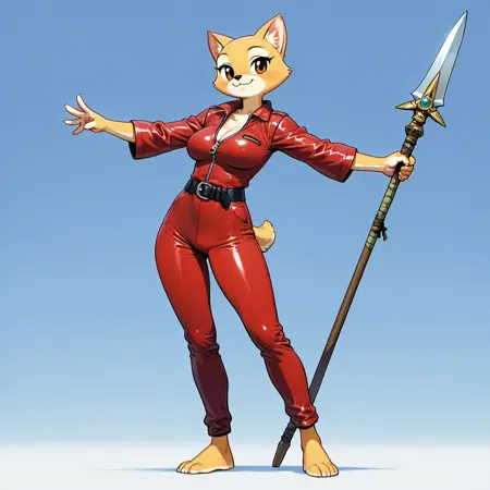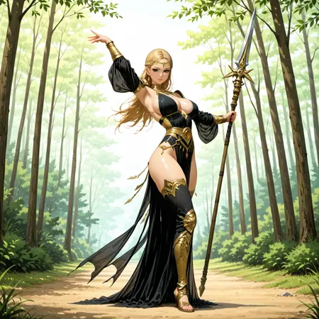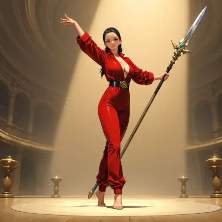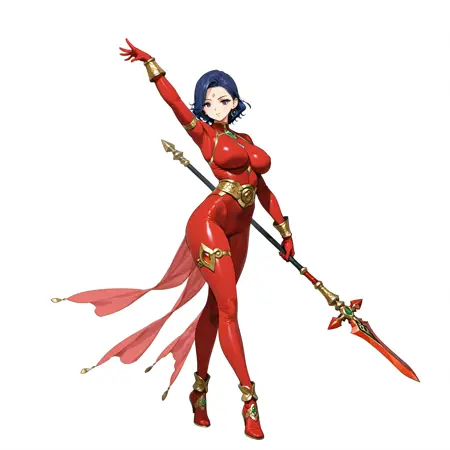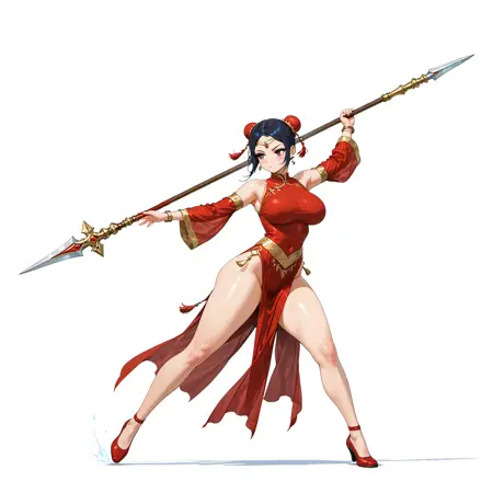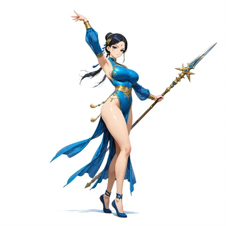 Short captioning: yd woman, 1girl, holding spear, dancing pose, full body