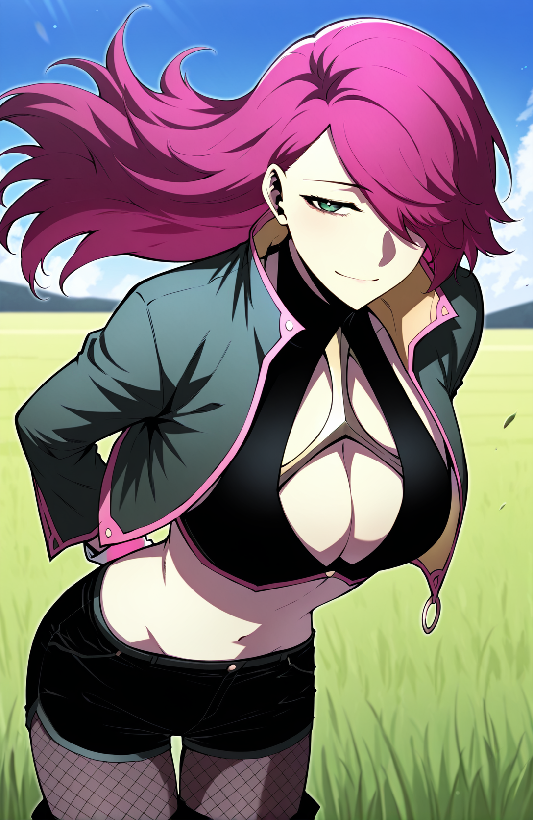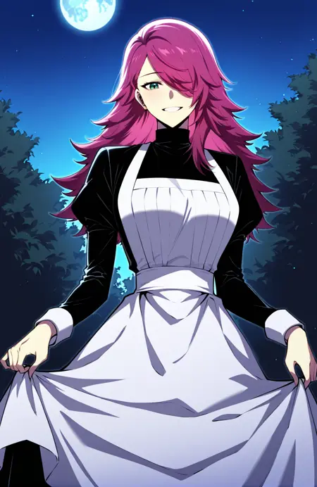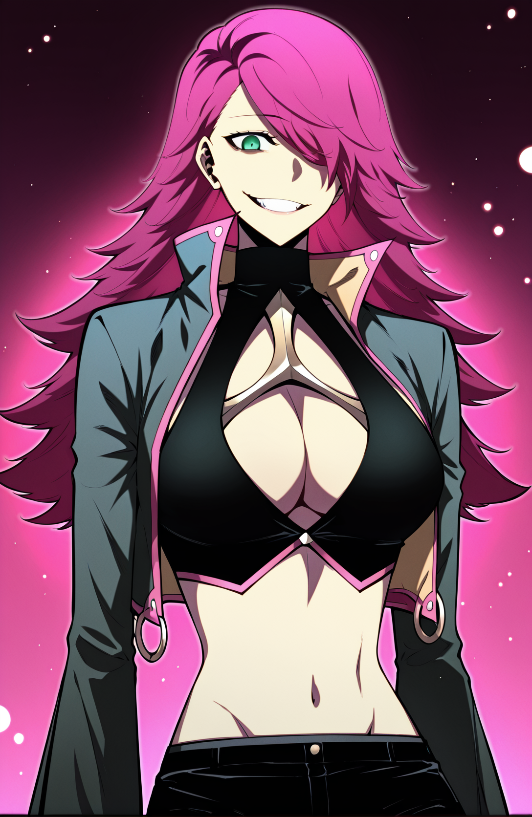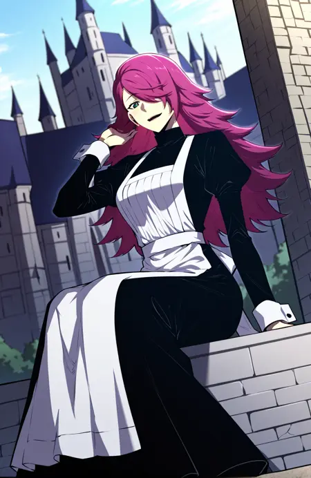 | Trained Words | Beris, 1 girl, solo, green eyes, magenta hair, long hair, voluminous hair, asymmetrical bangs, side swept bangs, hair over one eye,Copied! Beris_outfit1, black crop top, cleavage cutout, deep v-neck, open cropped jacket, green jacket, pink trim, exposed midriff, black shorts, fishnet stockings, thigh-high boots, white gloves, circular decoration on gloves,Copied! Beris_outfit2, maid uniform, black long-sleeve dress, high-neck dress, white apron, full length skirt, cuffed sleeves, white cuffs,Copied! |