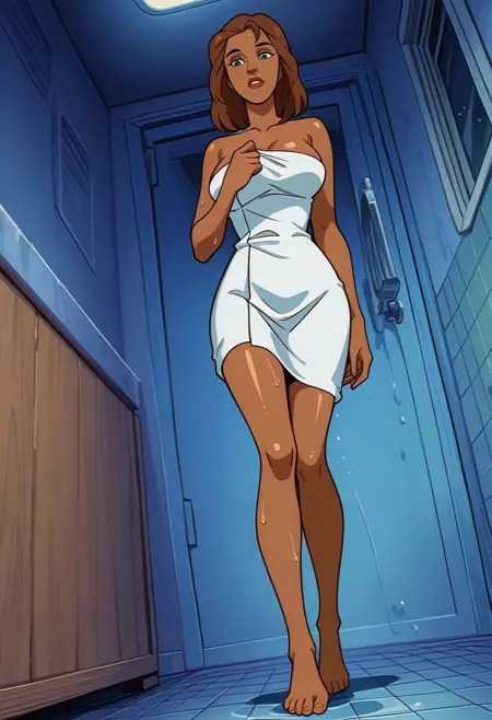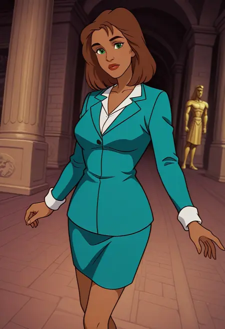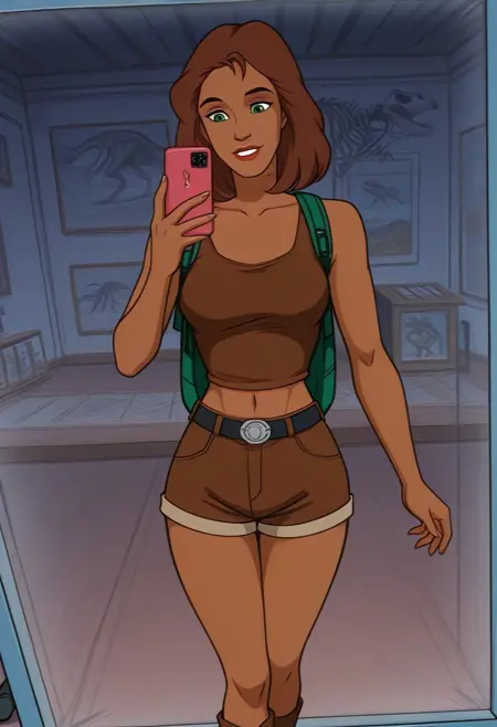 彼女の衣装はデフォルトの色で出力されますが、必要に応じてブレザー、スカート、ハイヒールには "_aqua" や "_teal" を使用しています。さらに、彼女のキャンプ用衣装を適用したい場合は、「brown collared shirt, long sleeves, brown pants, belt, boots」とプロンプトに追加してください。