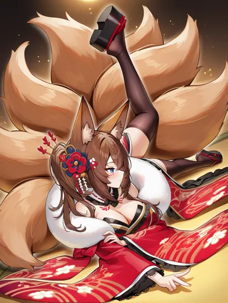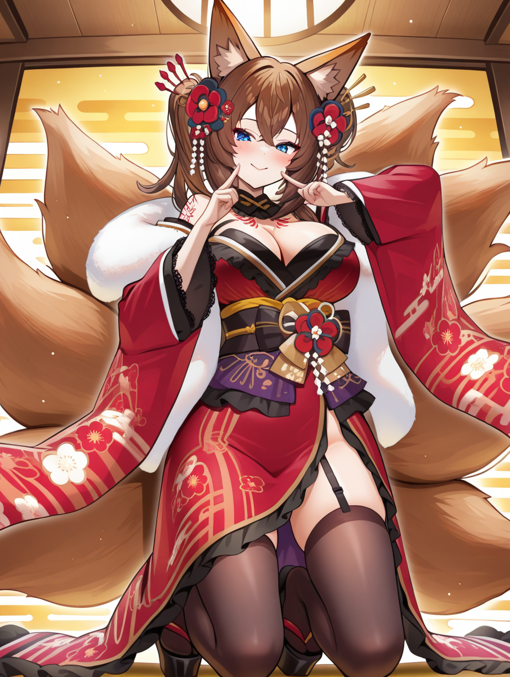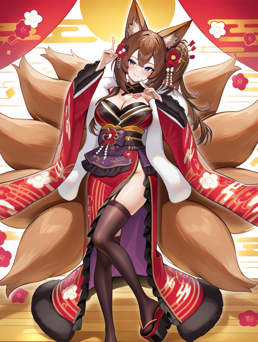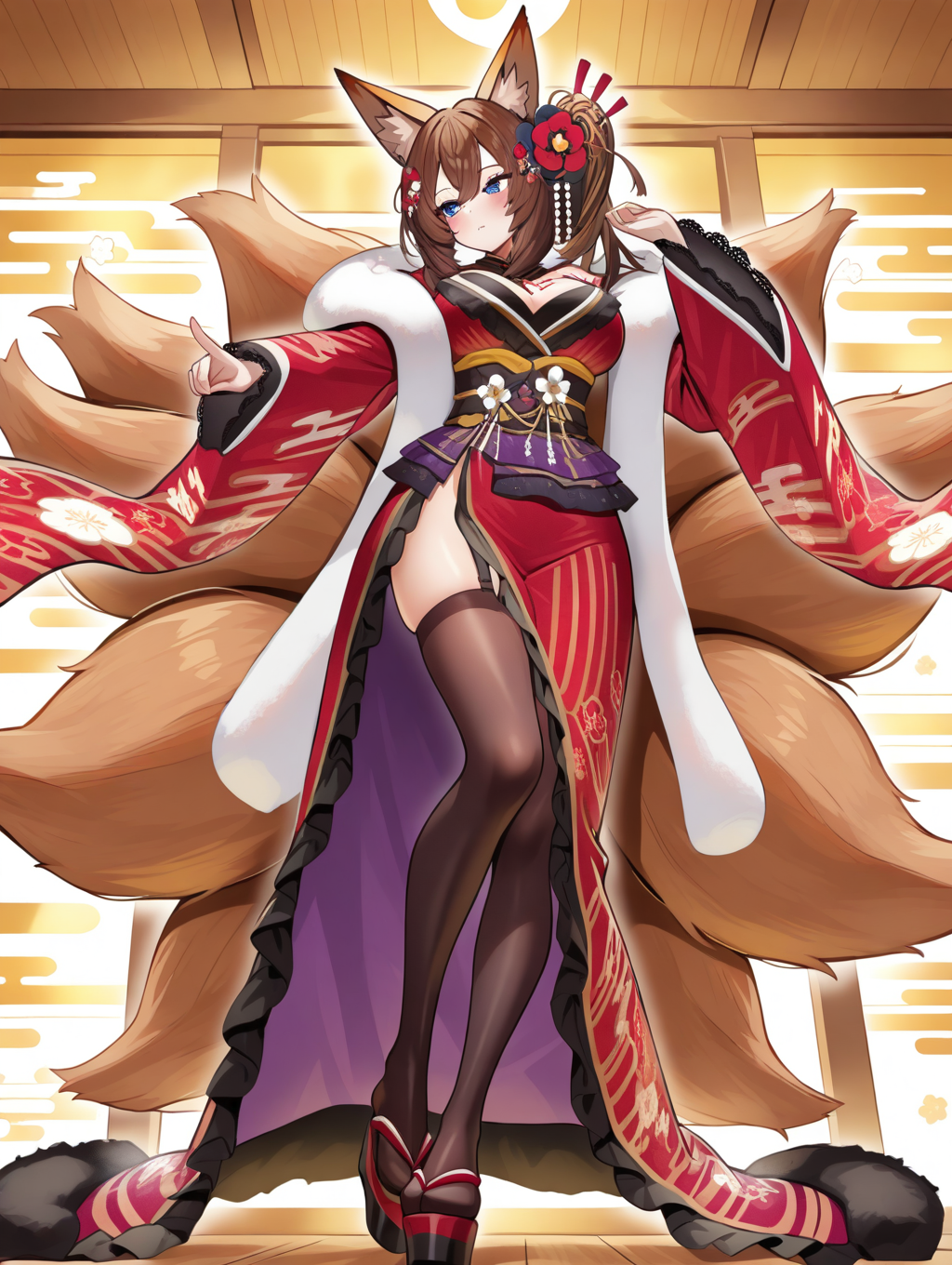 提示示例:gyouko,棕色头发,侧马尾,蓝眼睛,发饰,狐狸耳朵,狐狸尾巴,狐娘,可拆卸领子,纹身,红色日本服饰,宽袖,蕾丝边,毛边,印花和服,侧开衩,荷叶边,黑色过膝袜,厚底鞋,