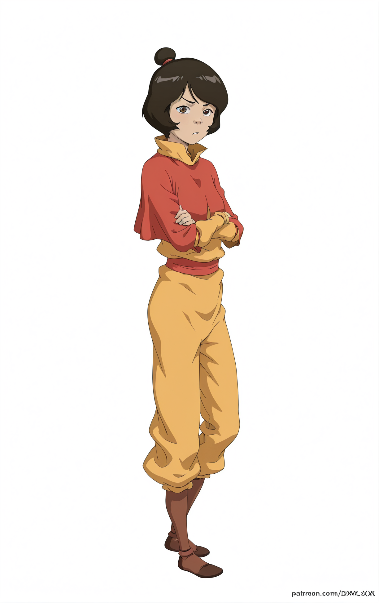 jinora_sdxl outfit1, アイア・ノマッドの服、茶色の靴、黄色のジャンプスーツ、赤い短いキャペレット、高い襟、
