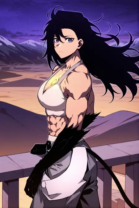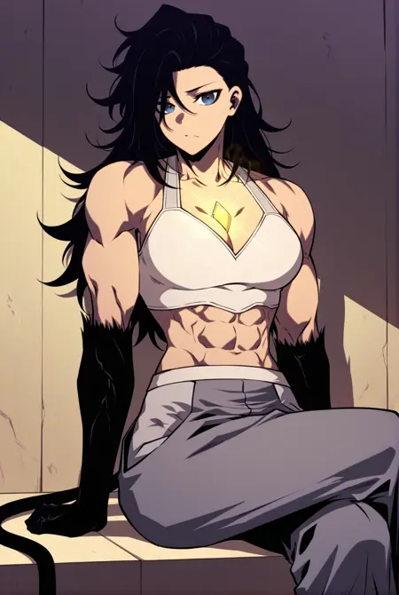 Beliz, 1 girl, solo, blue eyes, muscular female, six pack abs, medium skin, long black hair, messy hair, side part, swept bangs, long bangs, black forearms, long black tail, cat tail, glowing golden gem, chest jewel,