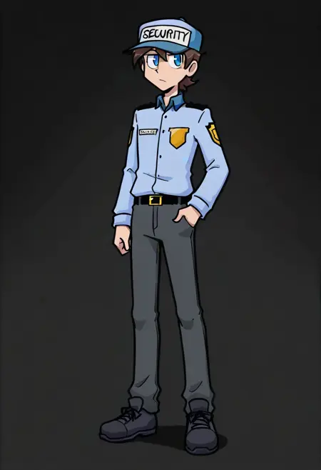 MikeSchmidtFNAF1, 1boy, security uniform, blue hat, wide blue eyes, blue hoodie, gray-black pants, gray-black shoes, brown hair