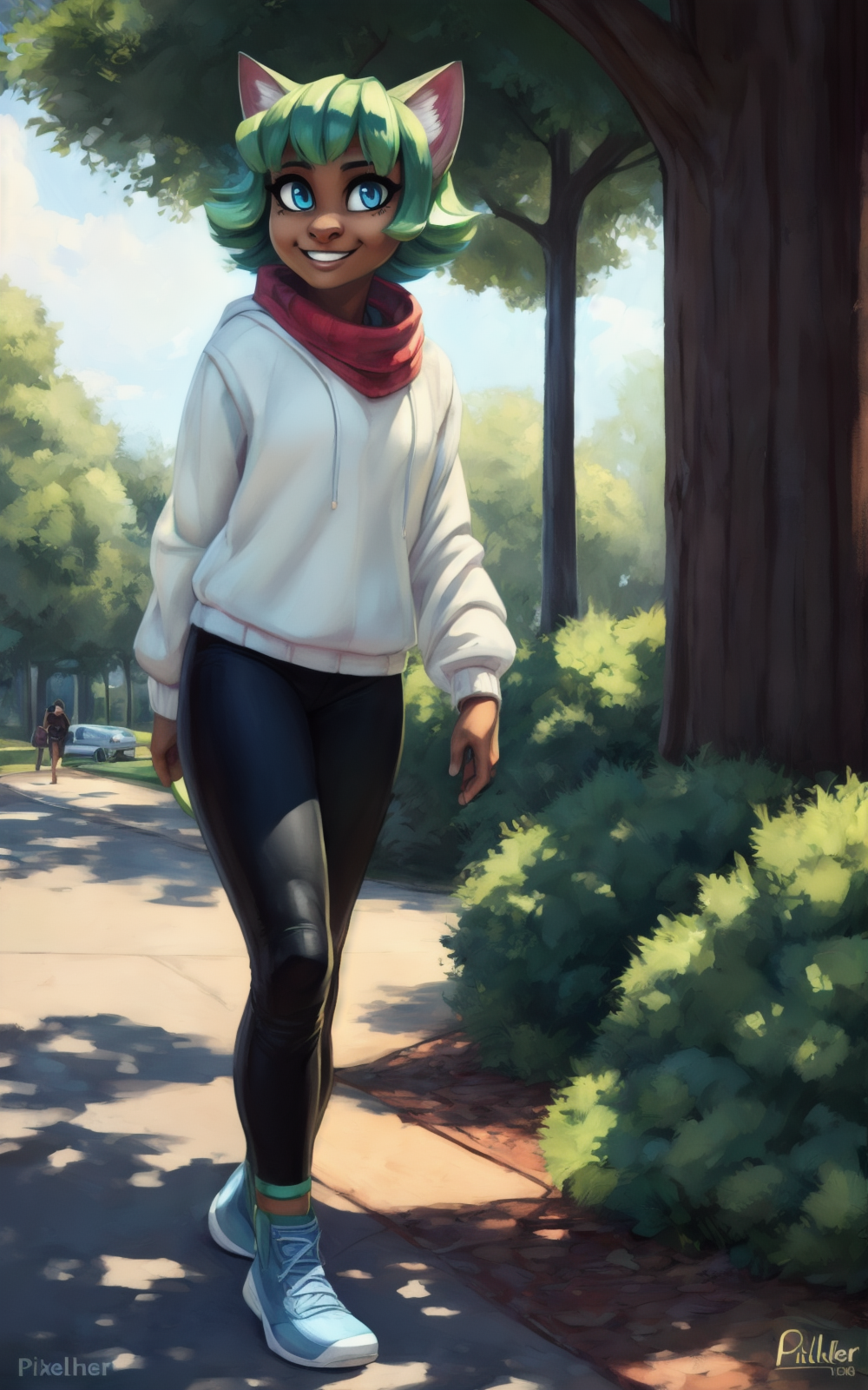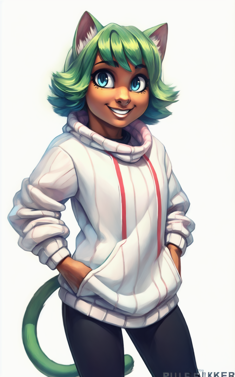 강화 태그: 동물 귀, 두 개의 꼬리, 고양이 귀, 고양이 꼬리, 녹색 머리카락, 검은 피부 여성, 고양이 소녀, 검은 피부, 단발, 좁은 동공, 파란 눈