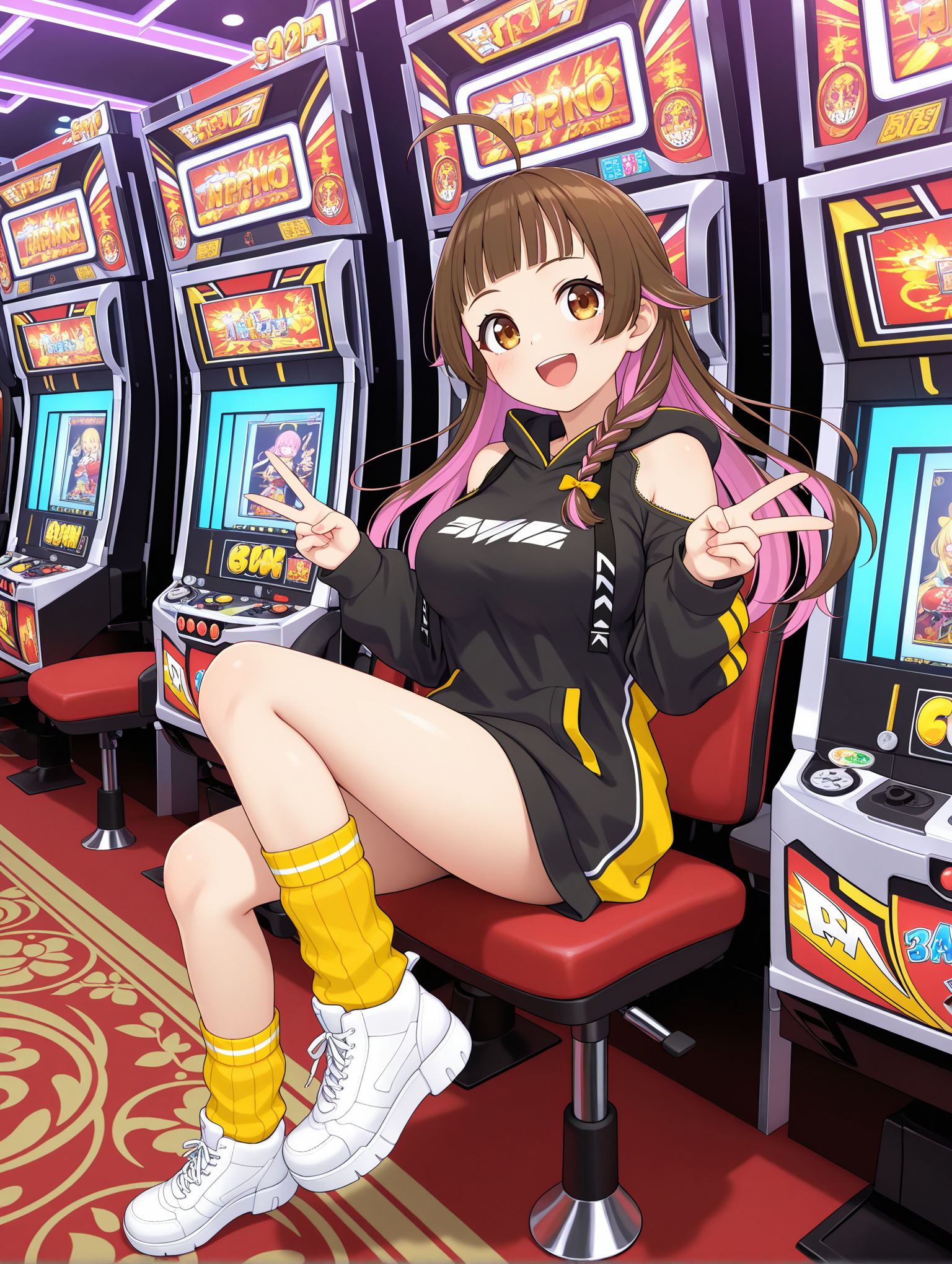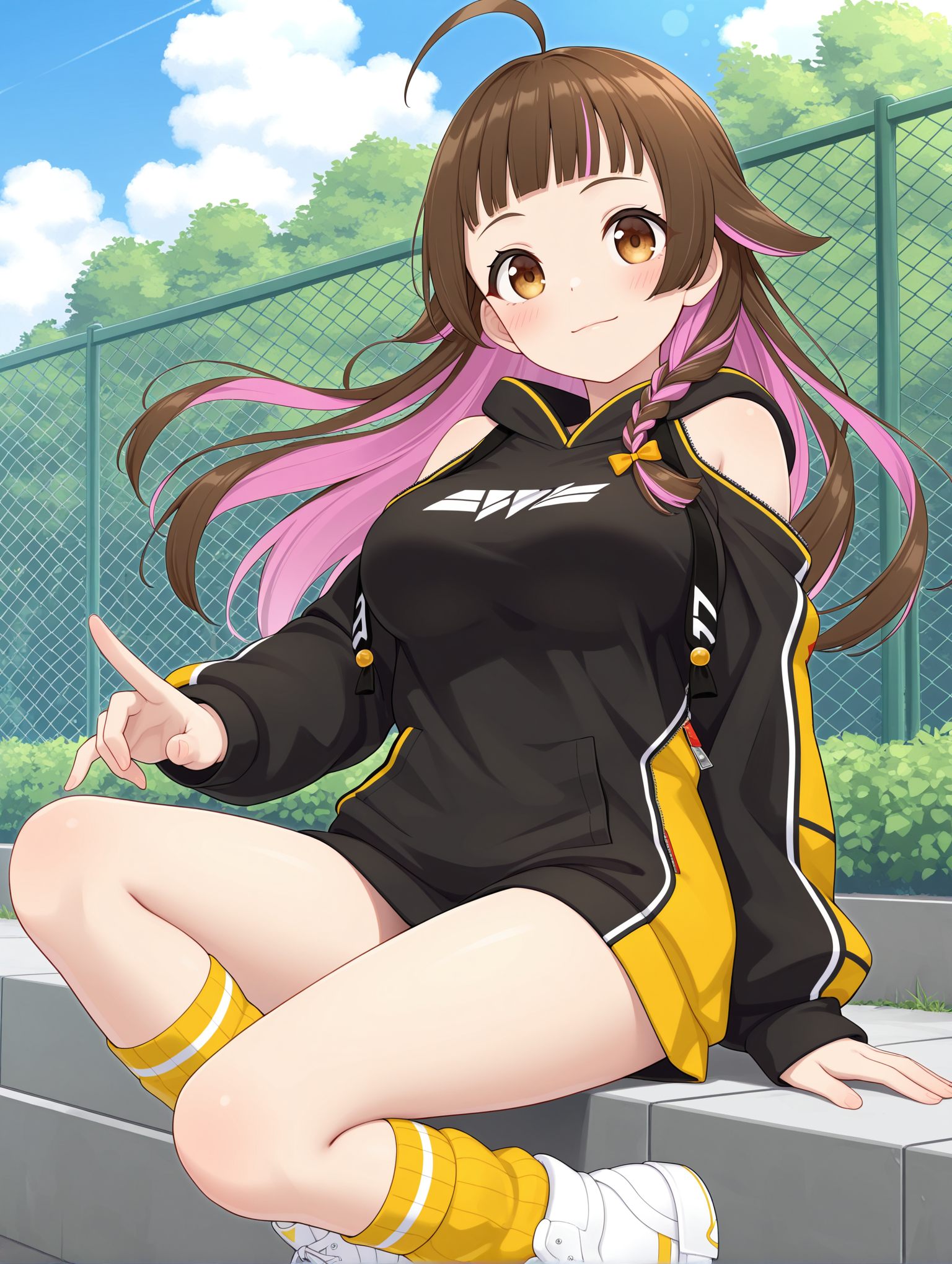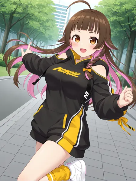| 학습된 단어 | uwanose_ren, brown hair, long hair, single braid, multicolored hair, two-tone hair, colored inner hair, pink hair, blunt bangs, ahoge, brown eyes, medium breasts,복사됨! hood down, black fabric with bold yellow accents, side pocket flap in bright yellow with red horizontal stripes, shoulder cutout,long sleeves, yellow socks, white sneakers,복사됨! |