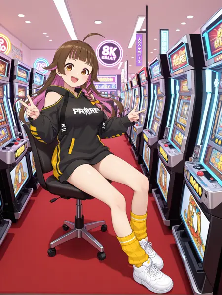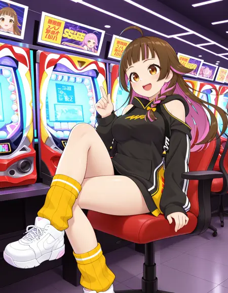 | Trained Words | uwanose_ren, brown hair, long hair, single braid, multicolored hair, two-tone hair, colored inner hair, pink hair, blunt bangs, ahoge, brown eyes, medium breasts,Copied! hood down, black fabric with bold yellow accents, side pocket flap in bright yellow with red horizontal stripes, shoulder cutout,long sleeves, yellow socks, white sneakers,Copied! |