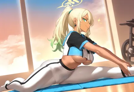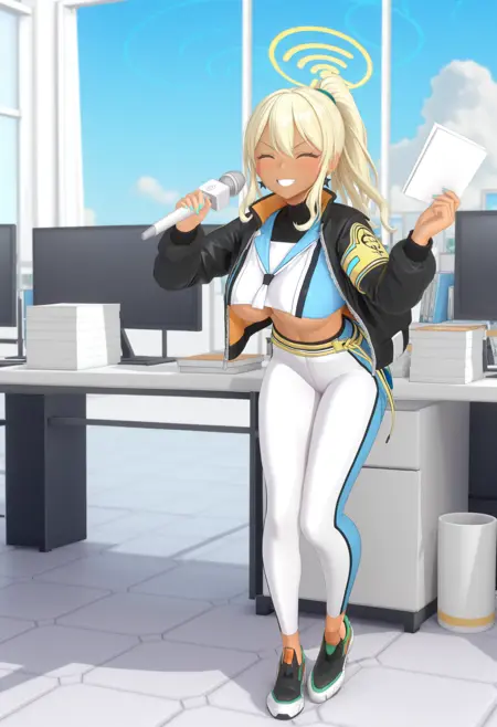 双色上衣, 白色和蓝色露脐上衣, 蓝色水手领, 黑色内搭, 露出下胸, 露腰, 露脐, 双面夹克, 黑色飞行员夹克, 开襟夹克, 长袖, 拉链, 黄色臂章, 双色长裤, 白色和蓝色瑜伽裤, 高腰裤, 黄色腰带, 运动鞋,