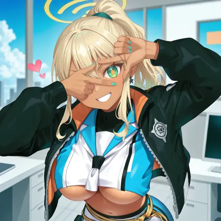 kawarush1non, 深色皮肤女性, 金色长发, 马尾辫, 侧发, 绿色发圈, 头发位于眼睛之间, 绿色眼睛, 橙色星形瞳孔, 黑色星形耳环, 黄色光环, 大胸, 水蓝色指甲,