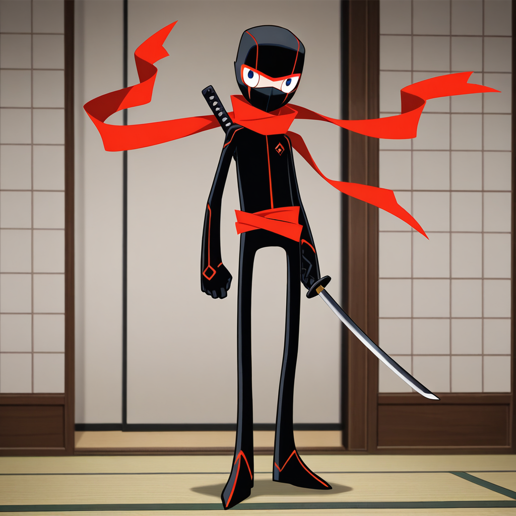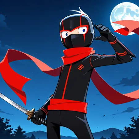 p: ninja_cosplay, red_long_scarf, red_waist sash, cartoon:0.5,