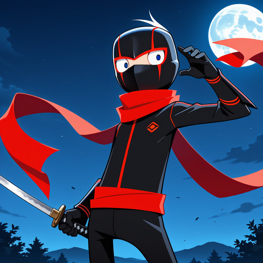 p: ninja_cosplay, red_long_scarf, red_sash, cartoon:0.5,