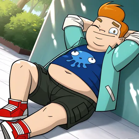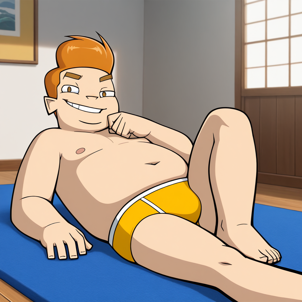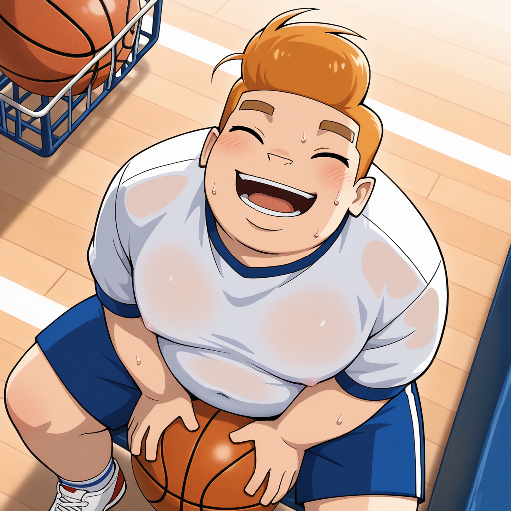 rchoww, pompadour, orange_hair, chubby, 1boy, short_male, solo,