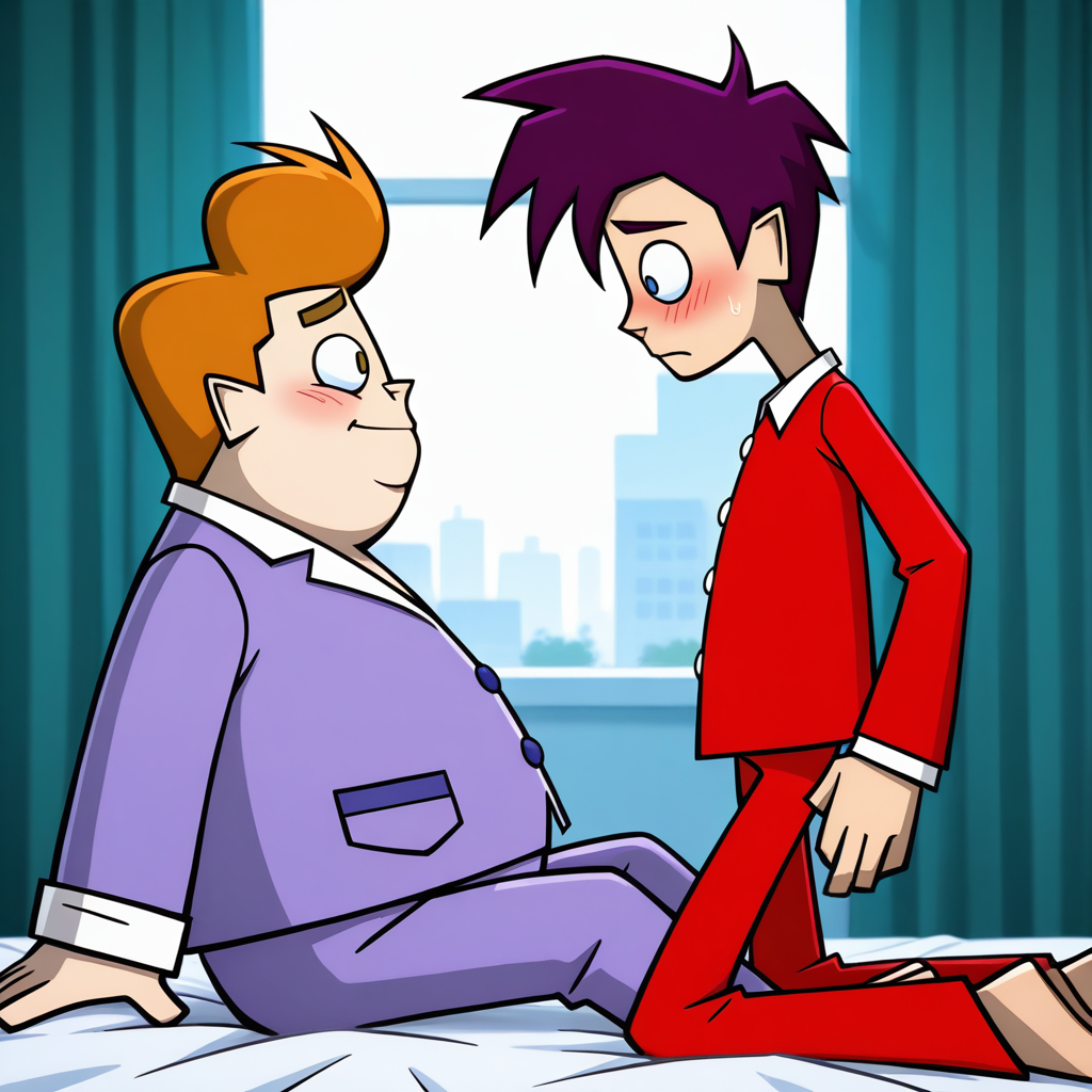worst_quality, low_quality, sketch, jpeg artifacts, out-of-frame censoring, looking ahead, pectorals, abs, signature, watermark, alternate_art_style, ((two-tone hair, multicolored hair)), giant, gigantic, fusion, mutation, age difference, pregnant, big belly, same action, same hairstyle, bad anatomy, child, toddler, shota, purple pompadour, orange spiked hair, black hair, ↴