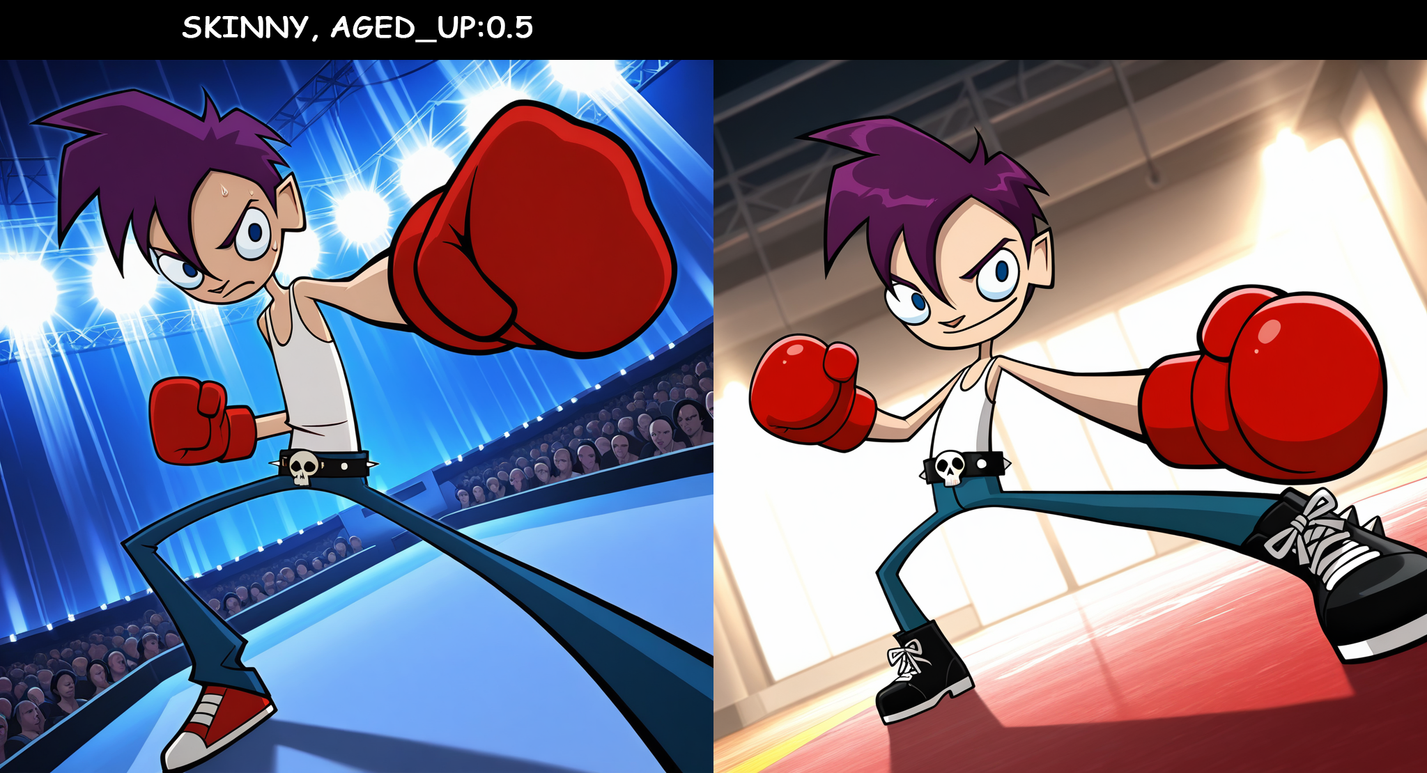 white_tank_top, red_boxing_gloves, skull_belt, blue_pants, purple sneakers