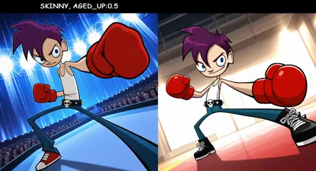 Use “skinny, aged_up:0.5” when wearing T-shirts, as this better preserves the anatomy of the body, half of the torso, and half of the legs, but if you don't want to, omit it and the result will be more similar to the series.