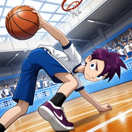 gym uniform, white_t-shirt, blue_shorts, purple sneakers,