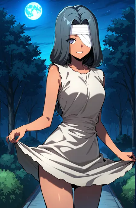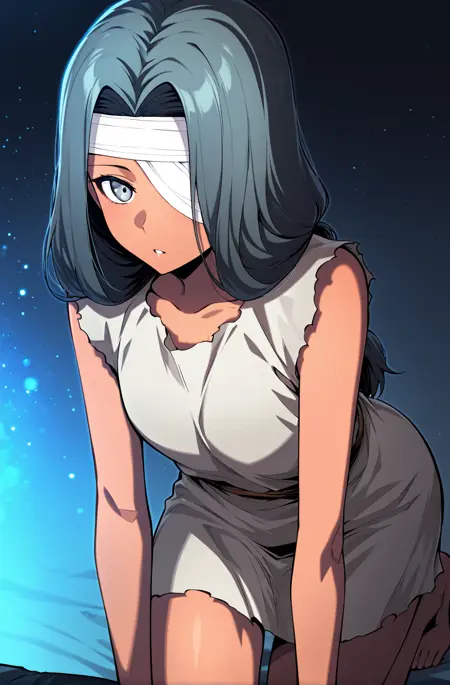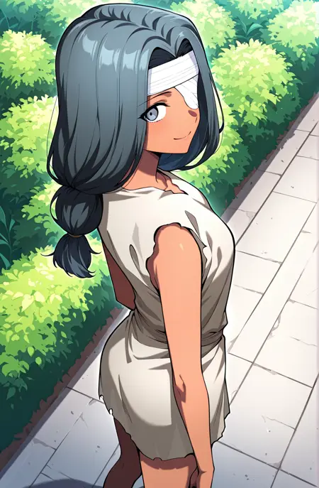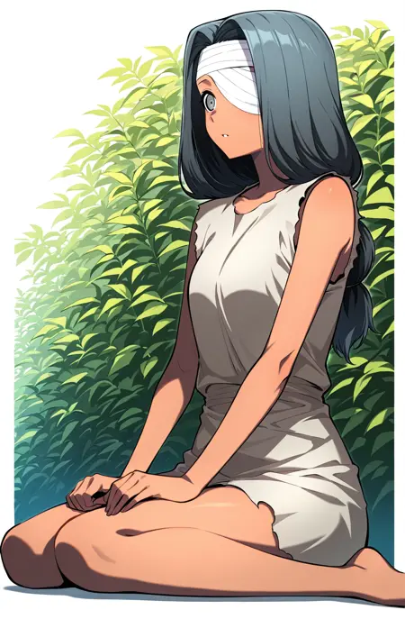 Tika, 1 girl, solo, dark skin, long hair, dark gray hair, straight hair, center parted hair, low ponytail, tied hair, bandage over eyes, white eye bandage,
