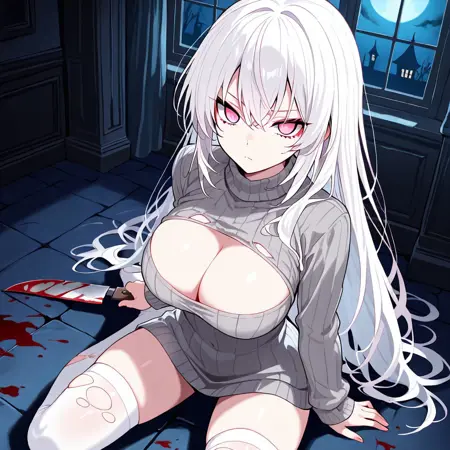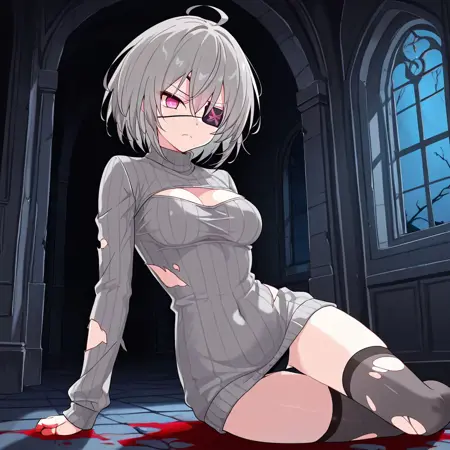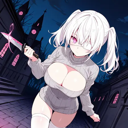 服装:敞开式毛衣,白色过膝袜,匕首,眼罩,医疗眼罩,一只眼睛上缠着绷带