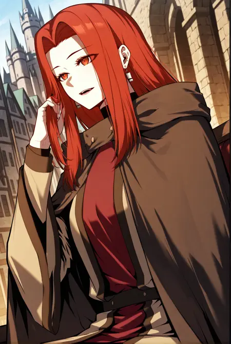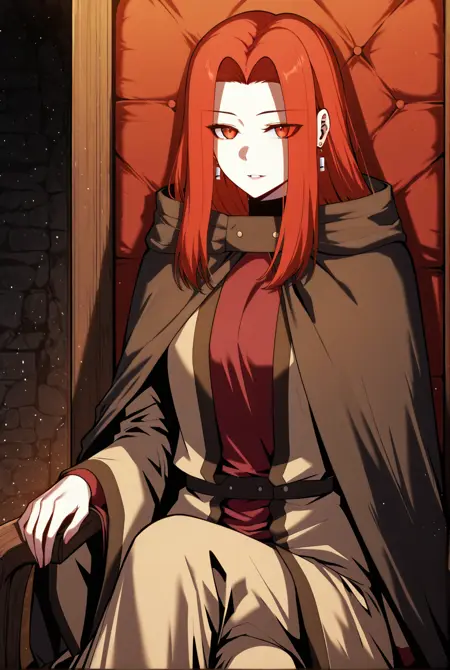 Valeria_outfit, dark brown cloak, high collar cloak, buttoned cloak, red inner robe, beige outer robe, layered robe, long sleeves, wide sleeves, waist belt,