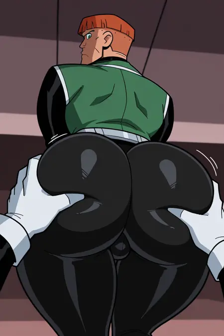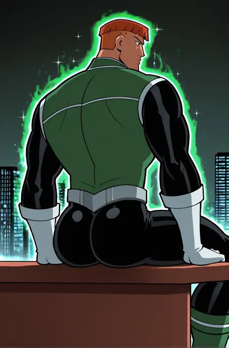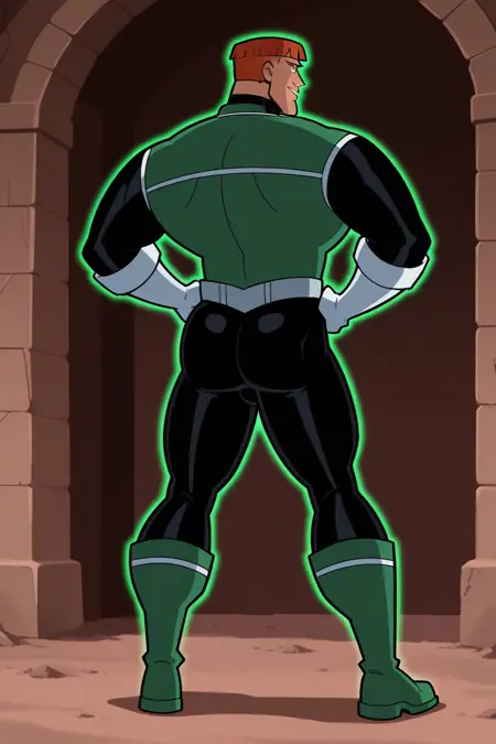 Guy Gardner, 남성, 성숙한 남성, 근육질, 주황색 머리, 진한 녹색 눈, 녹색 재킷, 검은색 소매, 흰색 장갑, 녹색 링, 은색 벨트, 검은색 타이트 스판팬츠, 녹색 부츠, 빛나는 녹색 아우라,