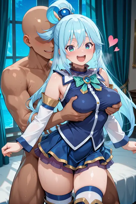 ilaqua, 1girl, breasts, nipples, aqua \(konosuba\), solo, thighhighs, skirt, long hair, skindentation, blue hair, smile, detached sleeves, blue eyes, underwear, clothes lift, looking at viewer, large breasts, panties, pussy, thighs, blush, night, skirt lift, sweat, panty pull, indoors, navel, white thighhighs, blue skirt, white panties, bare shoulders, boots, hair ornament, bow, bowtie, night sky, lifted by self, sky, closed mouth, hair rings, blue shirt, shirt, thick thighs<lora:illustrious Aqua 768x1152:1>