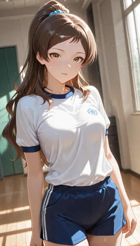 shirt, white shirt, ponytail, short sleeves, shorts, high ponytail, blue shorts, track jacket, gym uniform, sportswear, gym shirt, gym shorts, double vertical stripe,