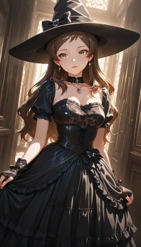 gloves, dress, hat, jewelry, very long hair, short sleeves, earrings, frills, black gloves, fingerless gloves, black dress, see-through, black headwear, witch hat, chain, frilled dress, gem, brooch, lace trim, strapless dress, lace, pendant, long dress, witch, halloween costume, bat (animal), layered dress, medium dress, lace-trimmed dress, lace-trimmed sleeves, lace-trimmed gloves, lace gloves, lace-trimmed choker