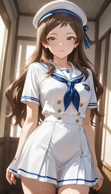 shirt, skirt, dress, hat, school uniform, white shirt, short sleeves, thighs, pleated skirt, serafuku, sailor collar, white dress, neckerchief, white headwear, beret, white skirt, hat ribbon, white sailor collar, sailor dress, double-breasted, sailor hat, blue neckerchief, sailor, white serafuku, pleated dress,
