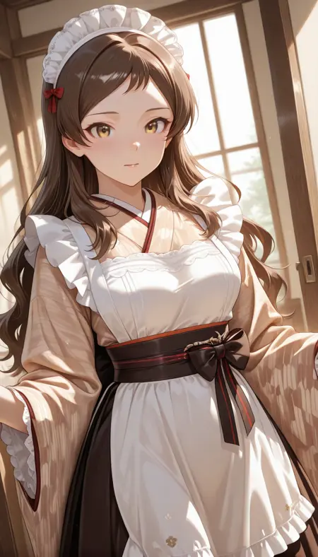 long sleeves, ribbon, frills, japanese clothes, wide sleeves, kimono, apron, sash, maid headdress, obi, frilled skirt, frilled sleeves, white apron, hakama, maid apron, hakama skirt, frilled apron, long skirt, wa maid, brown kimono, yagasuri, lace-trimmed sleeves,
