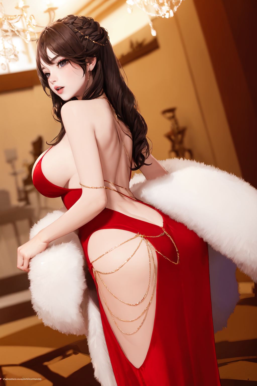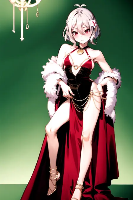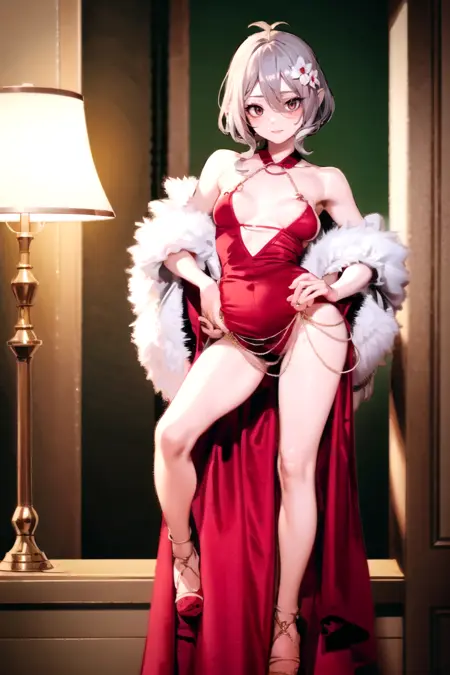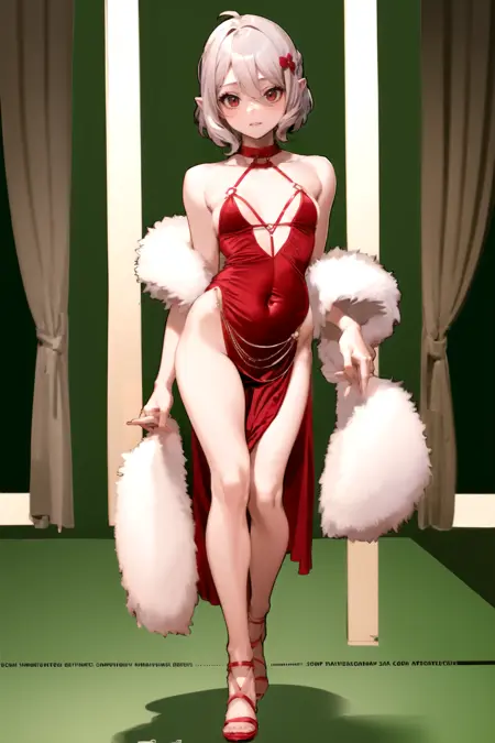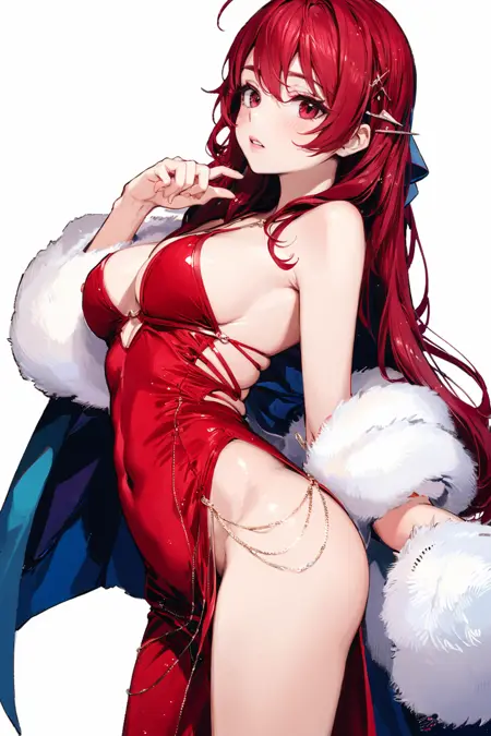 트리거 단어: 1girl,dress,solo,red dress,feather boa,breasts,backless dress,backless outfit,bare shoulders,hair ornament,hip vent,jewelry,necklace,sideboob,side slit,sleeveless dress,