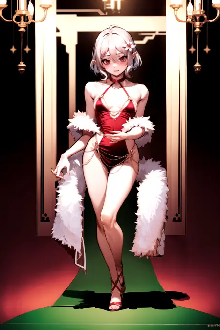 触发词(Trigger word): 1girl,dress,solo,red dress,feather boa,breasts,backless dress,backless outfit,bare shoulders,hair ornament,hip vent,jewelry,necklace,sideboob,side slit,sleeveless dress,