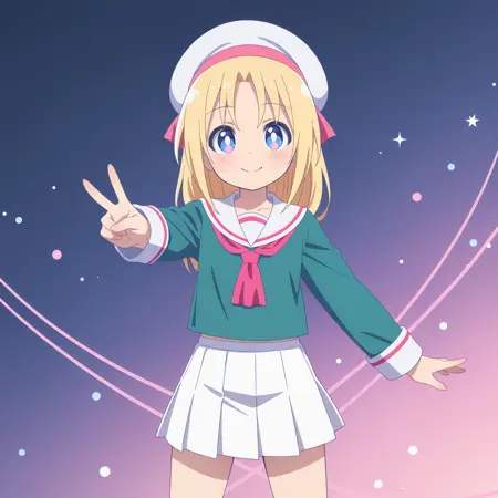 beret,white headwear,hat ribbon,pink ribbon,pleated skirt,white skirt,white sailor collar,long sleeves,pink neckerchief,miniskirt,green serafuku,white sleeve cuffs,