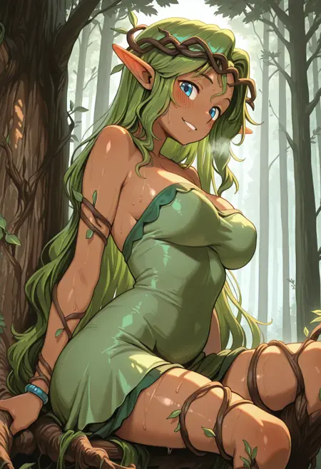 dryadmge, dryad, plant girl, pointy ears, tree legs, root-legs, vines, roots, tree