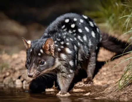 (raw photo) quoll drinking water from a puddle (viverrinus) (black fur)