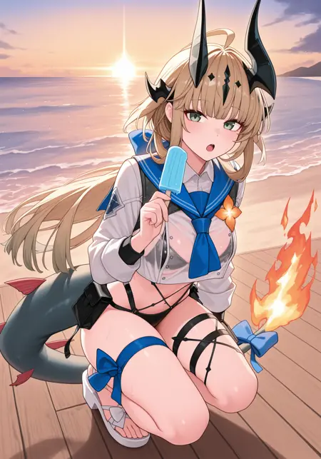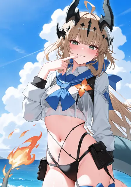 Summer Flower outfit: sumfl, hair ribbon, low ponytail, cropped shirt, blue sailor collar, belt pouch, black bikini, thigh strap, single thigh bow, flame-tipped tail, tail bow, white sandals