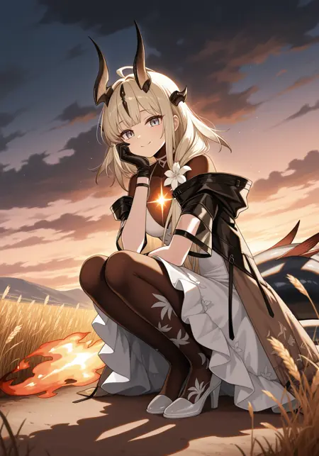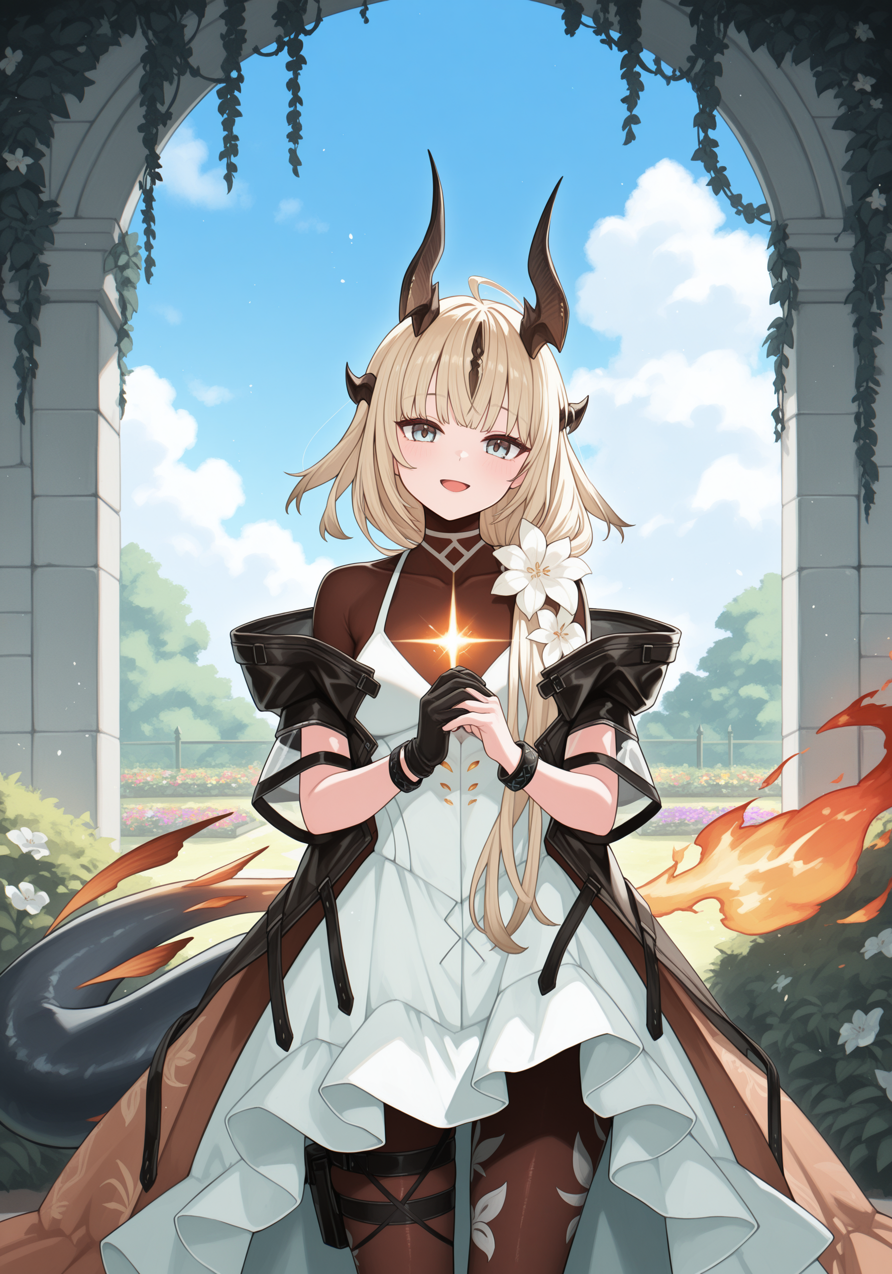 Default outfit: deflt, hair flower, bodystocking, open jacket, glowing chest, high-low dress, layered dress, short sleeves, single glove, printed pantyhose, flame-tipped tail, white heels