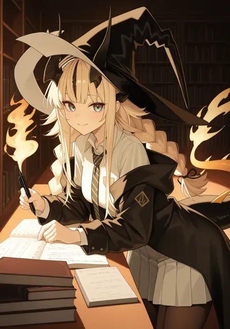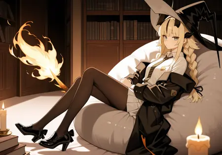 Curator outfit: crtr, witch hat, twin braids, black coat, collared shirt, striped necktie, white pleated skirt, pantyhose, flame-tipped tail, black heels