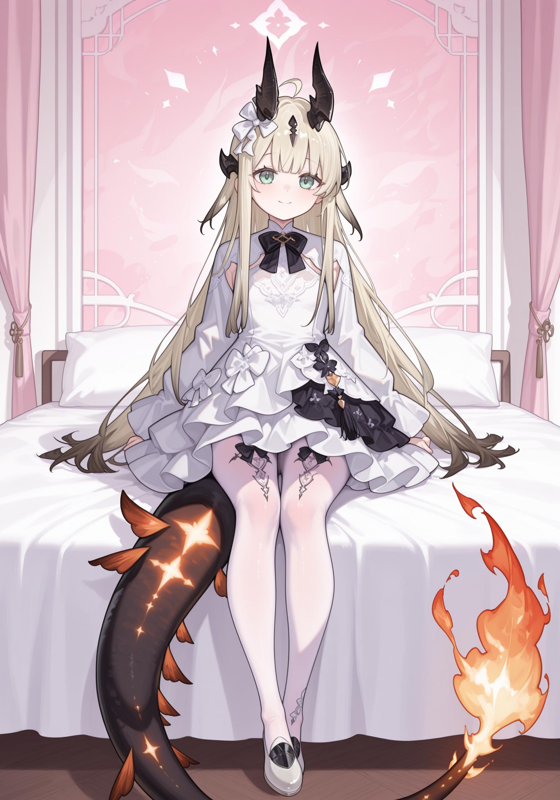 Younger Version: refs_ltl, hair ribbon, refs_dress, frilled dress, ribbon tassel, bowtie, white pantyhose, flame-tipped tail, white oxfords