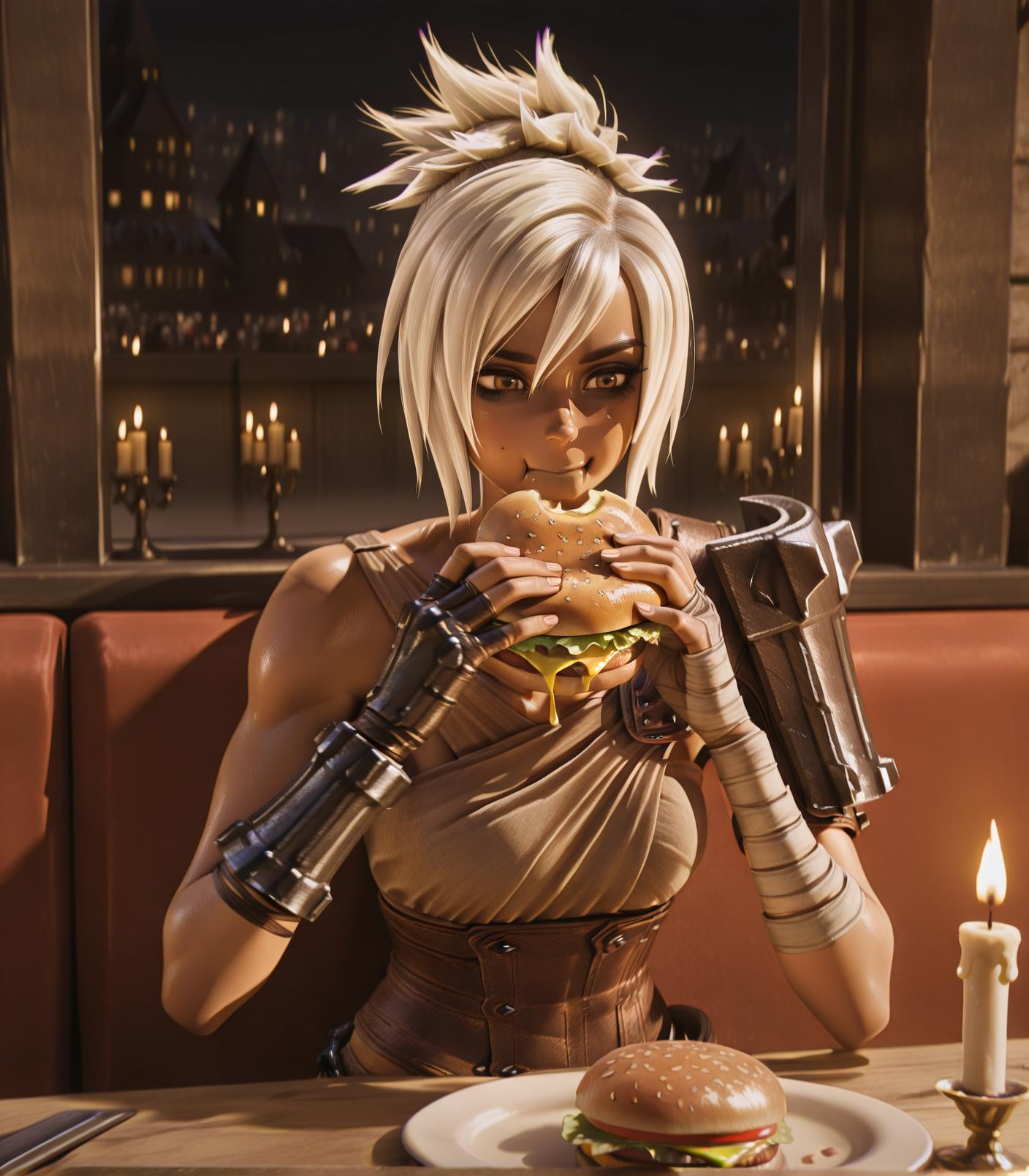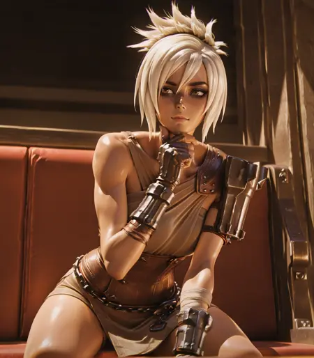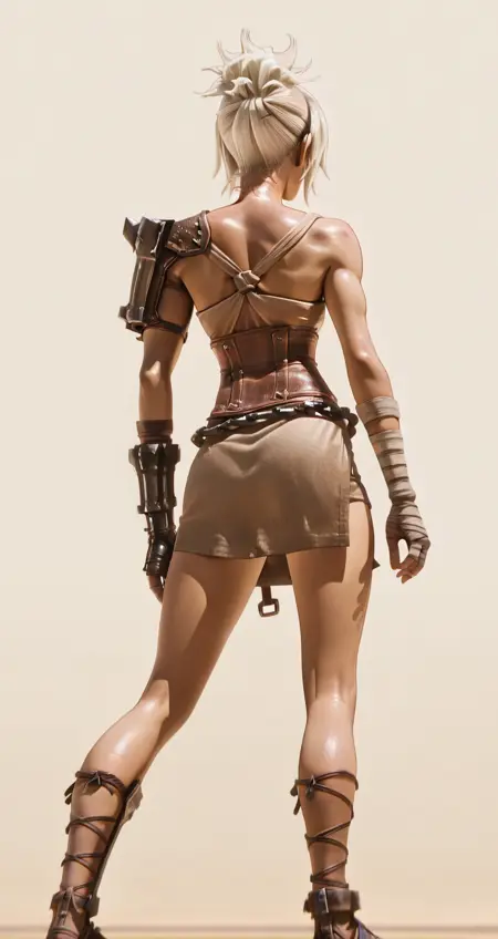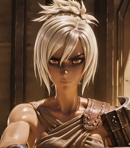1girl, riven, white hair, tied hair, black makeup around eyes, hazel eyes, right shoulder armor, single glove, bandaged arm, criss-cross halter, short white loincloth, brown leather bodice,