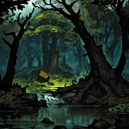 DDAreaWeald - 위ルド - 죽은 나무, 버섯, 부서진 돌벽으로 특징지어짐